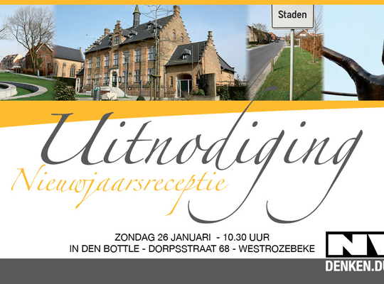 Kan u de kracht van verandering wel smaken? Kom dan zondag 26 januari zeker naar onze nieuwjaarsreceptie. Iedereen is welkom van 10.30 uur tot 13 uur In Den Bottle, Dorpsstraat 68, Westrozebeke voor een hapje en een drankje. Breng familie en vrienden mee. Iedereen is welkom! Graag een seintje op voorhand via els.degussem [at] n-va.be of 0498 57 71 13.